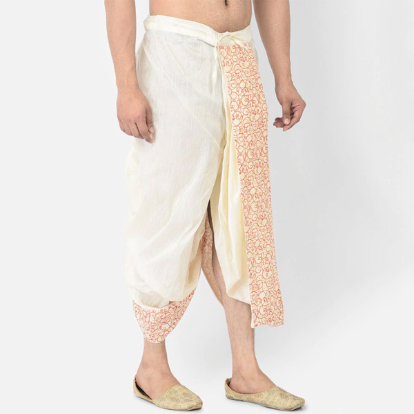 • Off white and orange printed dhoti with pleats, has a waistband with drawstring fastening